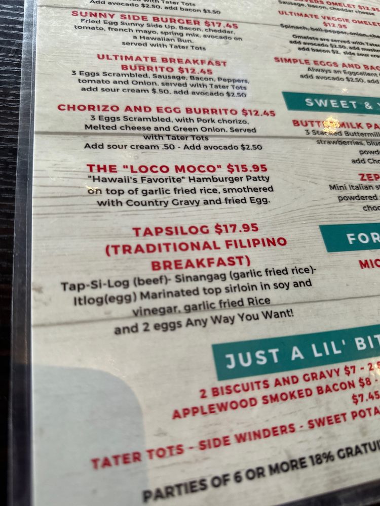 "hawaii's favorite " Hamburger patty on top of garlic fried rice, smothered with country gravy and fried egg